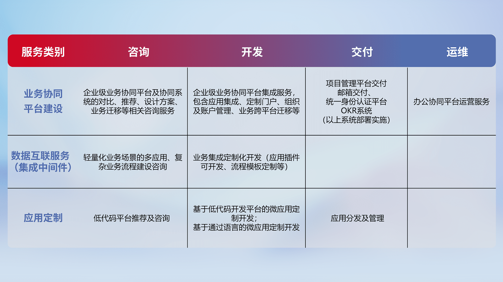 针对钉钉、、企微、、、IDaas等平台级产品提供产品的规划、、方案、、、、交付、、、定制化开发等服务,,,实现如统一协同办公、、智能客户服务、、、、混合会议管理、、智能数据查询、、、等业务场景,,,,实现数字化转型。。。